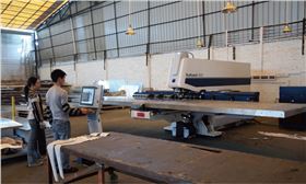 德国“通快”全自动数控冲床是一种用于铝单板钣金成型或分离的数控加工设备,把待加工的铝板材夹持在夹钳上,使铝单板材在上、下转盘之间相对于滑块中心沿X,Y轴方向移动定位,按规定的程序选择所需要的模具,并由滑块冲击模具,从而冲出所需尺寸和形状的孔来。这是一种通用、高效、精密的冲压机械,也是铝单板板材加工中的主要设备。